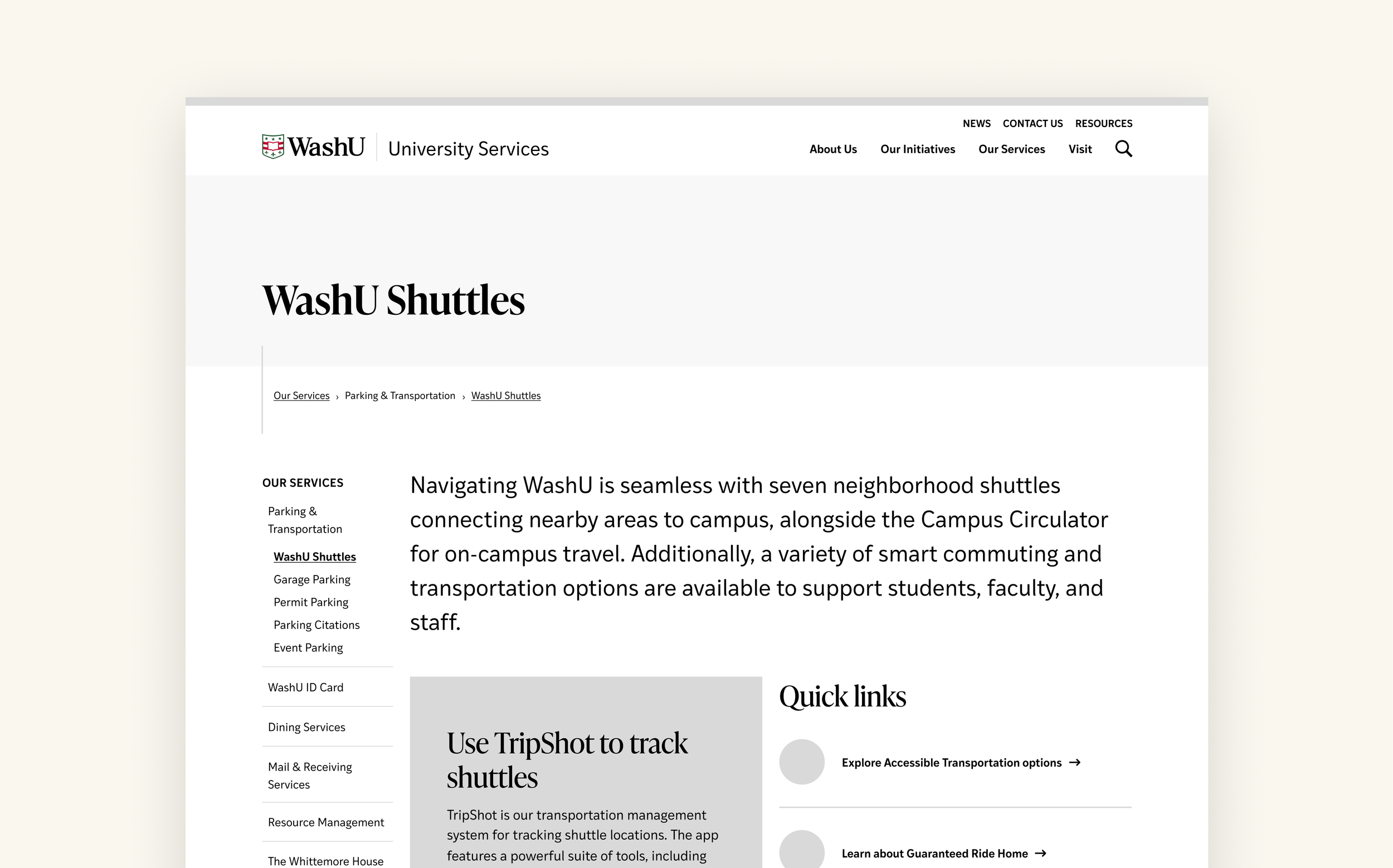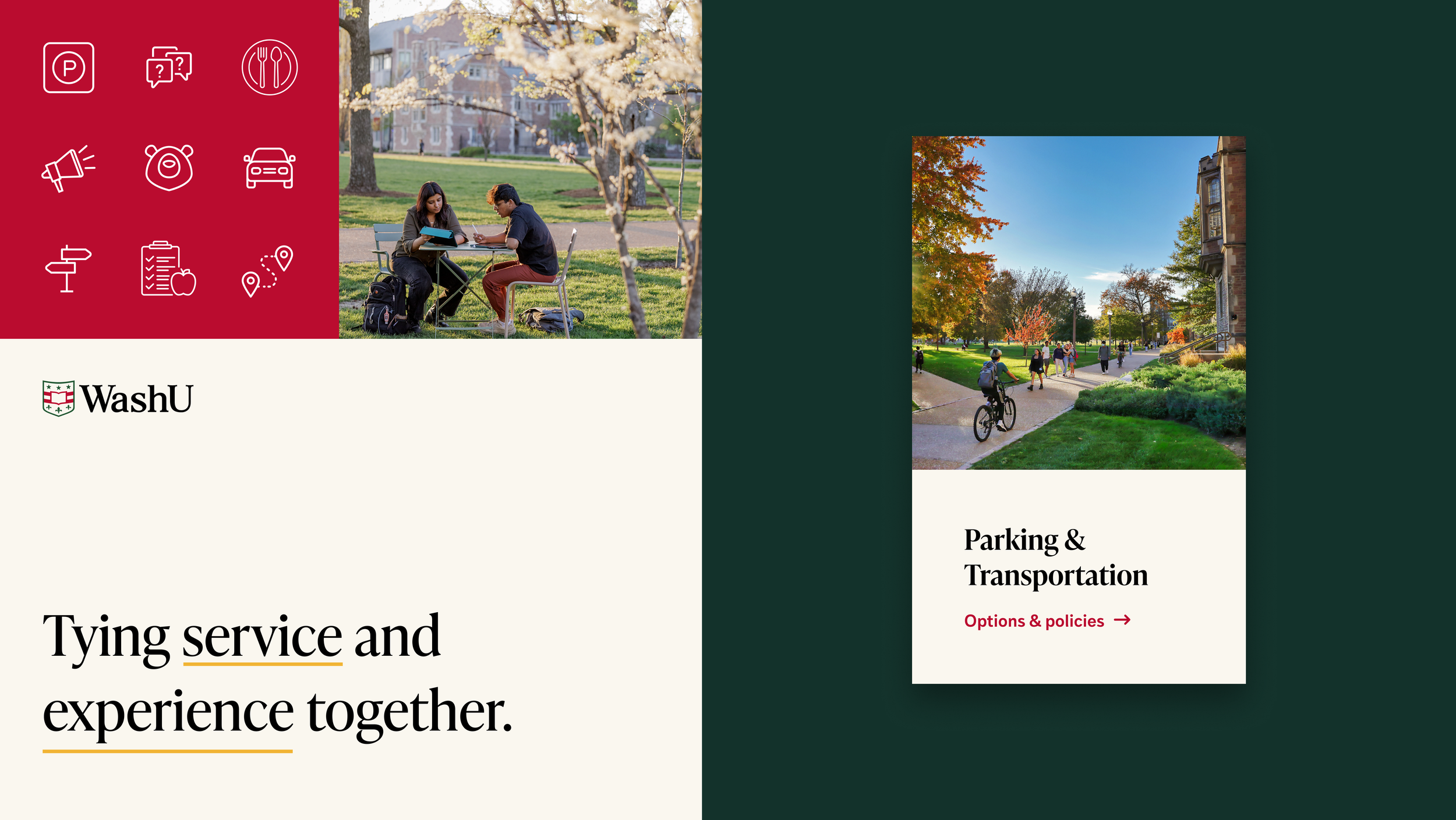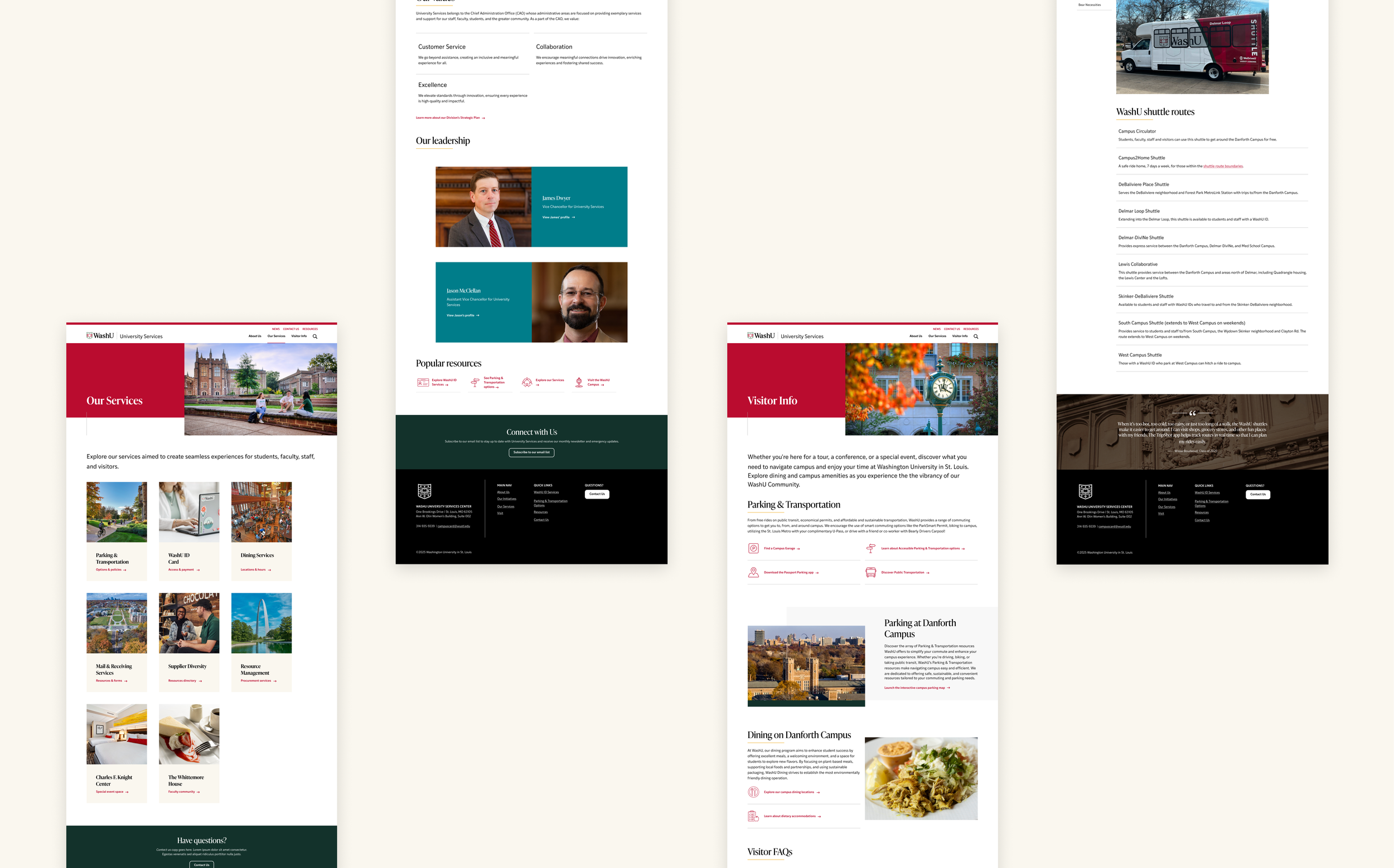 Washington University in St. Louis (WashU) launched a strategic initiative to reimagine the digital presence of its University Services division. Historically, essential campus functions—including Dining, Transportation, and ID Services—were siloed across ten fragmented, outdated websites. This project successfully consolidated these disparate resources into a single, modern "one-stop shop." By establishing a unified information architecture and adopting the university’s new visual brand identity, the initiative eliminated user confusion, reduced content redundancy, and solidified University Services as a reliable, accessible resource for the entire campus community.