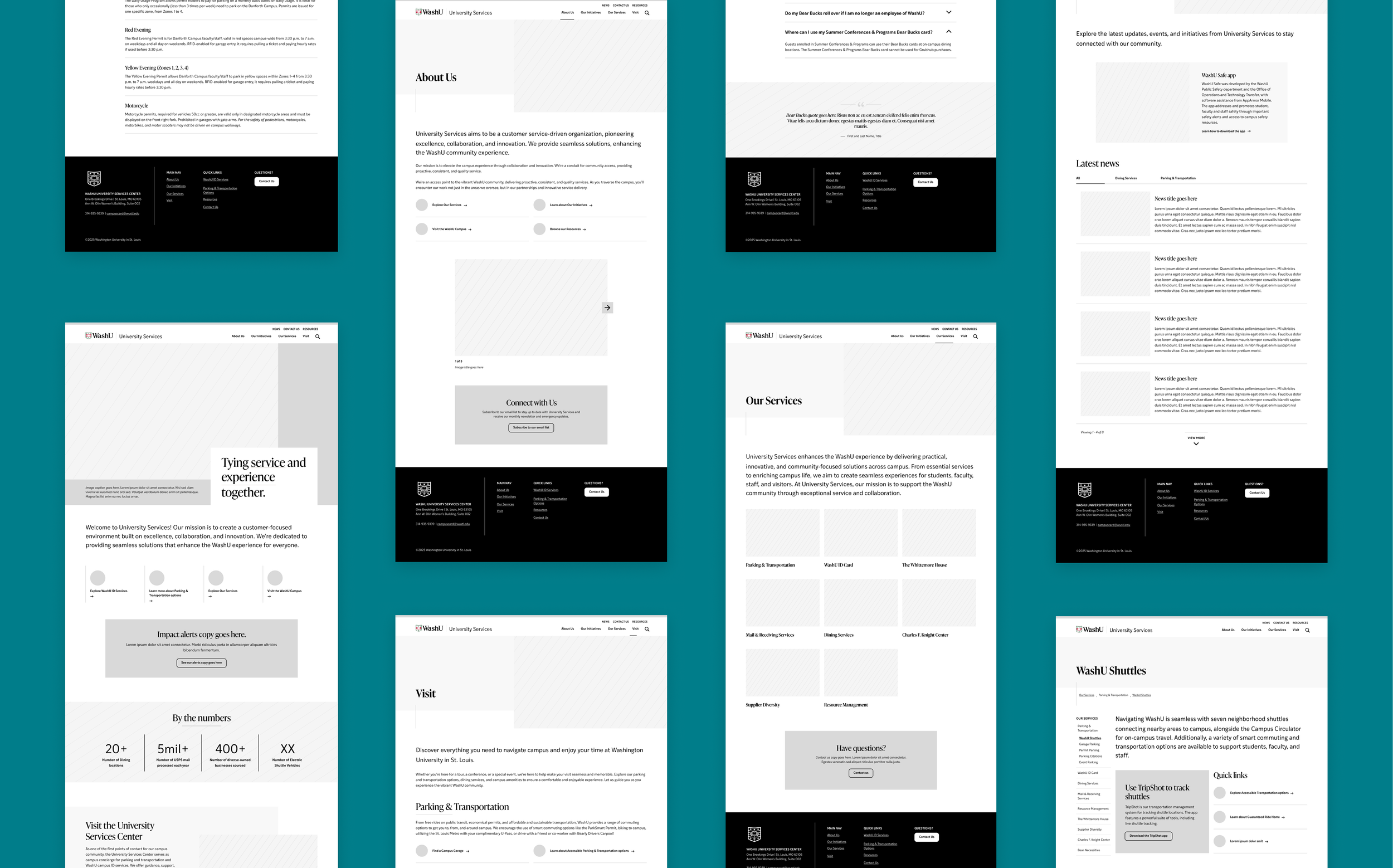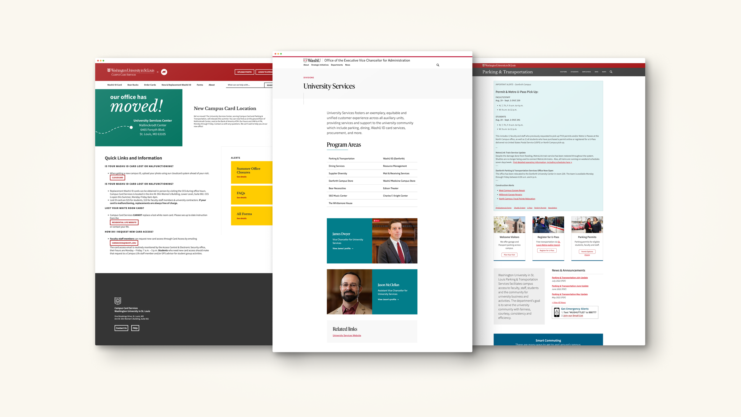 Once the IA was approved, the focus shifted to high-fidelity wireframes and design comps. The site was structured into three core areas: the University Services umbrella, WashU ID Services, and Parking & Transportation, ensuring a balanced hierarchy.